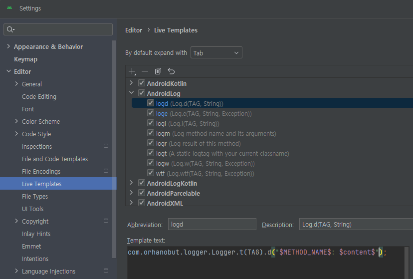안드로이드의 기본 로그 자동완성 ( logd+TAB ) 을 변경하면 편하다.