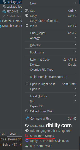package.json에서 오른쪽 마우스 클릭. Show npm scripts! 나타남.
